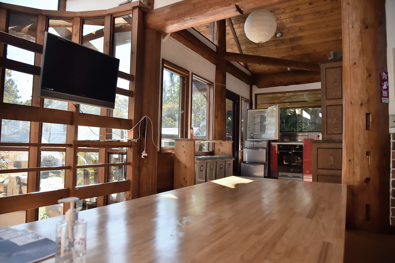 共用キッチン、アルプスビューが眺められる2階ラウンジ ※写真はログホテルです。