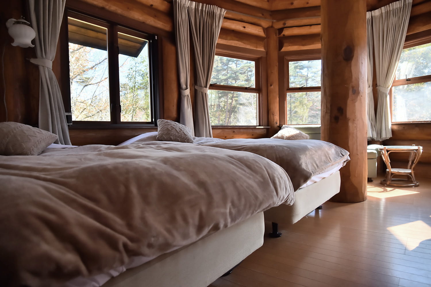 木の温もりが心地よいログのお部屋。4月~11月まではわんちゃんとご宿泊可。