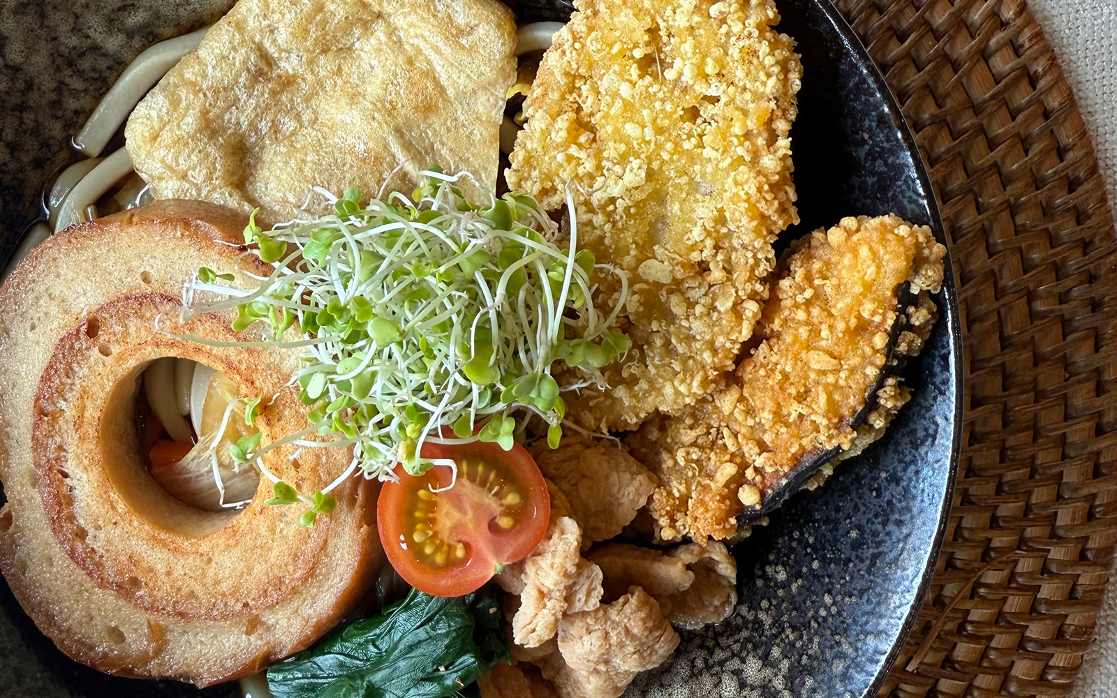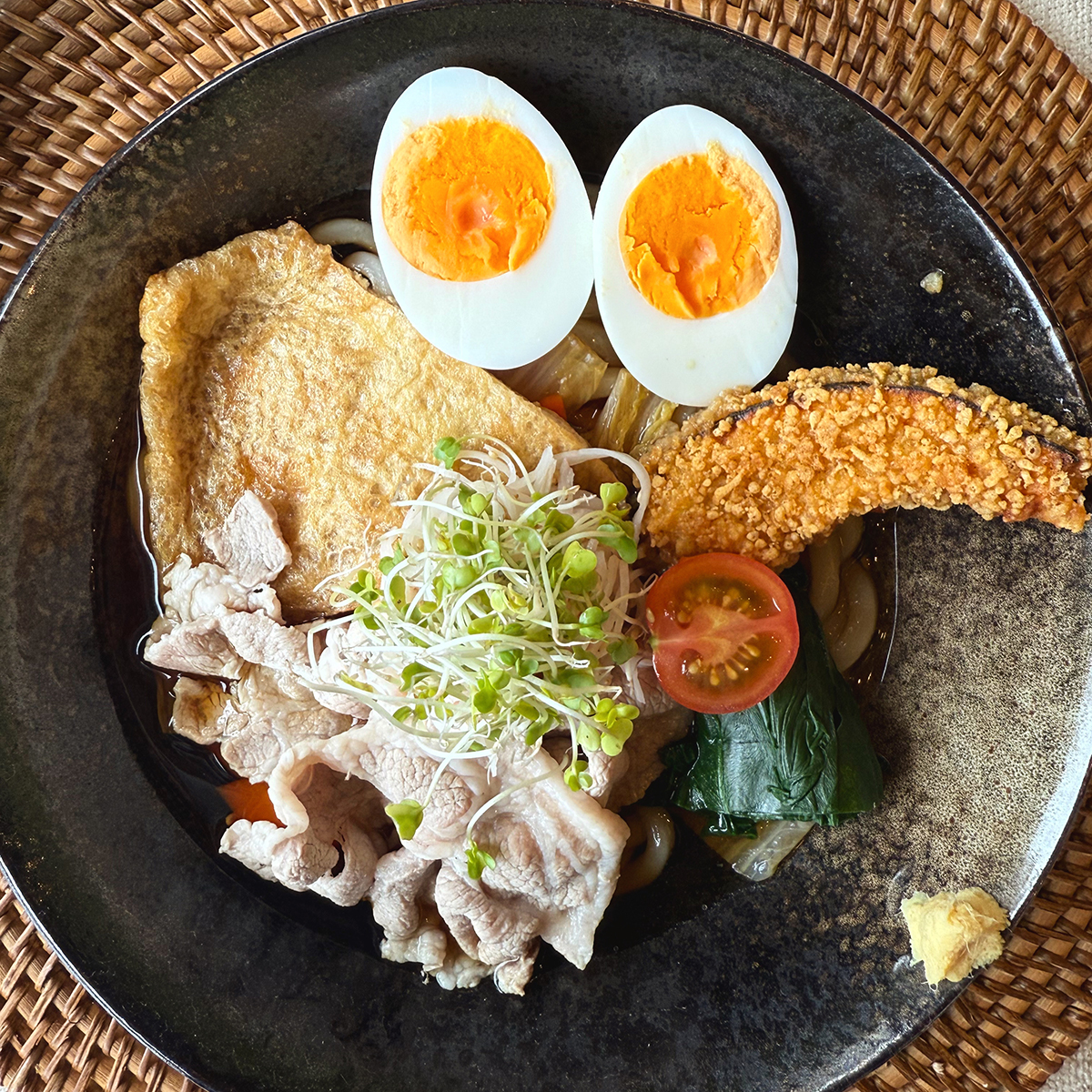 We generously use Shinshu ingredients, such as free-range pork raised in the open fields of Azumino; Hakuba-produced Shinshu salmon; raw honey from Northern Shinshu; and seasonal vegetables.